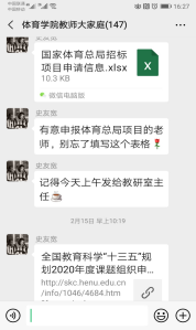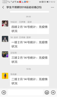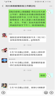 为保证疫情情况统计有效开展,学院教工以党支部和教研室为单位,学生以年级、班级和寝室为单位建立专门的网络工作群。各党支部书记、教研室主任、辅导员和学生党员干部每天在规定时间内完成相关情况(当天有无发热、咳嗽,有无接触疫区人员和出行情况等)统计并汇总给学院负责人,及时向学校防疫相关部门反馈。