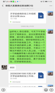 积极应对和正面宣传是本次疫情防控的重点。雷竞技RAYBET最新版党委充分认识当前严峻的防控形势,以坚决阻击病毒进校园为首要目标,配合学校疫情防控工作,积极、主动、高效落实上级的决策部署。积极响应上级传达的疫情防控相关文件和会议精神,主动学习之后迅速、有效、准确,分层次、按要求的向各工作口的负责同志和全体教职工生传达到位。