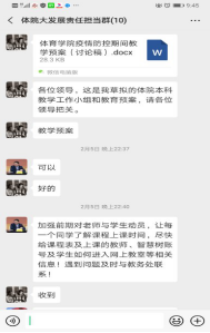 疫情初期,学院已经开始筹备在线教学预案,得到了各个教研室的一致赞同。随即,学院开始主动对接学校教务处和在线教学相关平台,获取支持。在接到学校教务处关于“停课不停学”的指导意见后,学院进一步加大推进力度,全面开展“如何结合体育专业特点进行在线教学”的大讨论,同时根据任课教师选择的在线平台和课程实际,有针对性地开展个性化服务,较早的完成疫情期间在线教学安排和正式上课前的预演,有效的推进了网络教学的开展。